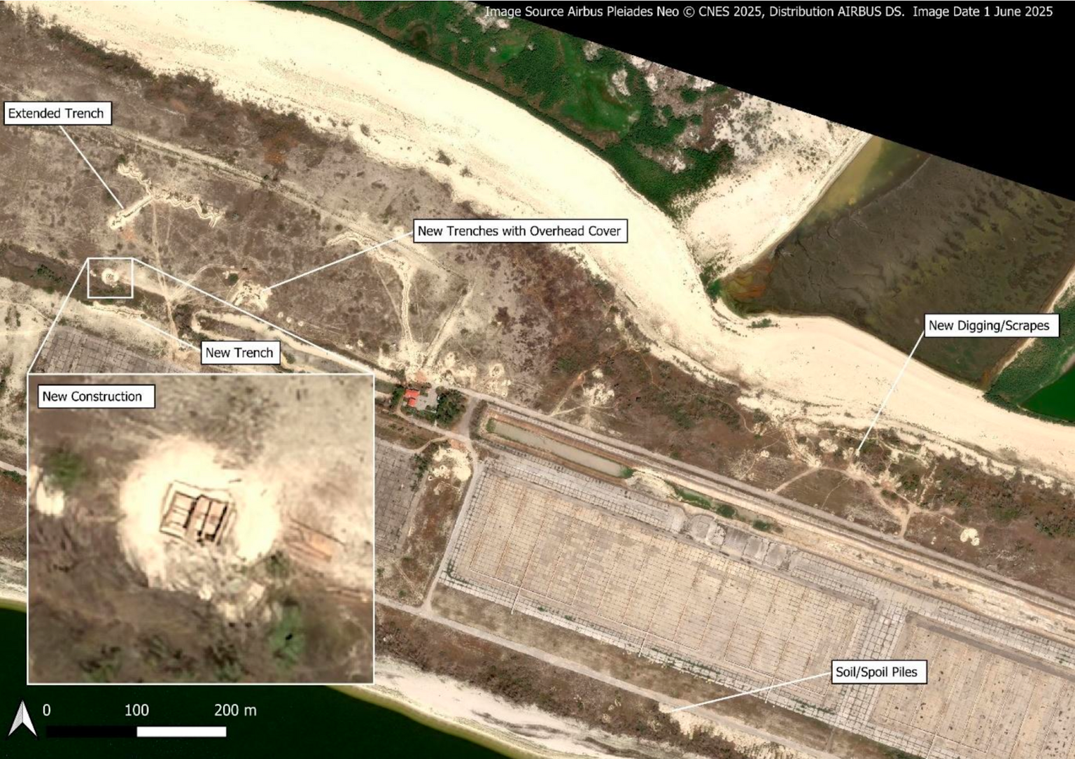 Greenpeace Ukraine’s senior nuclear specialist Shaun Bernie says that the nuclear plant increasingly resembles a military base, rather than a special-purpose facility where any military activity is unacceptable. For example, around the sluice gates and along the western and northern banks of the cooling pond, the satellite images show the construction of permanent buildings with the features of reinforced bunkers. In addition, hangars and fortified structures of the kind typically found along a frontline have been identified around the perimeter of the station, many protected with metallic anti-drone cages.