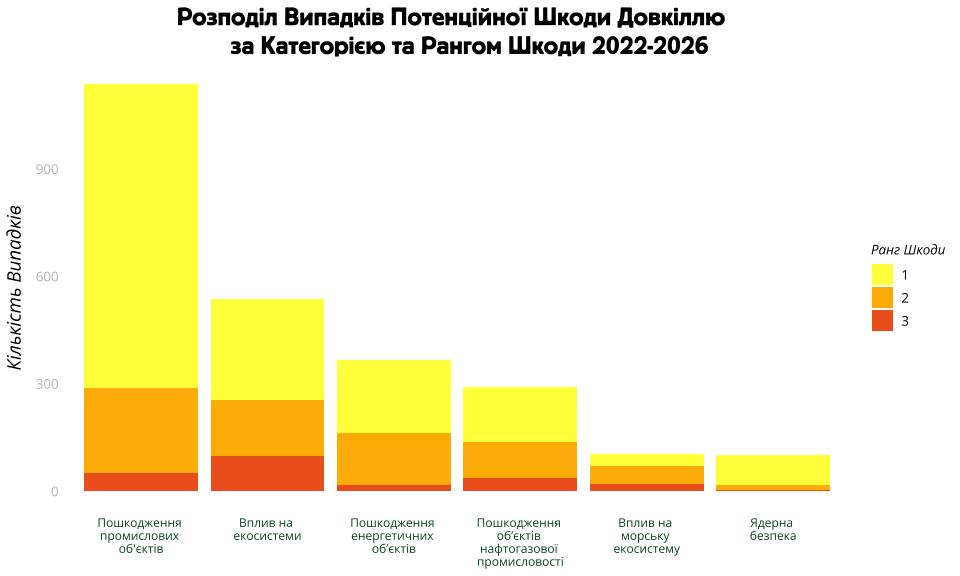 While the Ecodiya team recorded 726 cases in 2022, 446 in 2023 and 442 in 2024, the highest number of incidents was recorded in 2025—931. Why? Because it was in 2025–2026 that Russia began launching targeted attacks on industrial facilities and Ukrainian infrastructure, which has led to increasingly dire consequences for the environment.