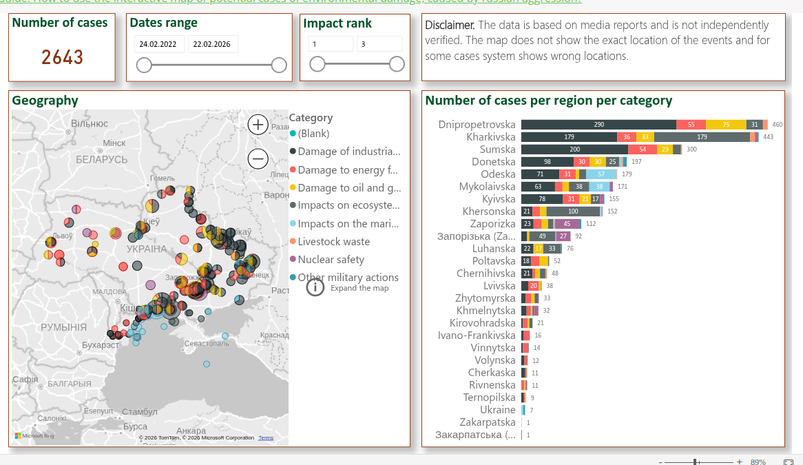 “While emissions rose across all impact categories during the fourth year, war-driven landscape fires surged for the second consecutive year. Unusually hot and dry conditions—likely intensified by global warming—turned even minor sparks from combat into uncontrollable blazes, as firefighting remained impossible. This vicious cycle underscores how armed conflict and climate change exacerbate one another,” explains Lennard de Klerk, the lead author of the report. The climatic consequences are only part of the environmental consequences of the war. In four years of independent monitoring, Ecodiya has recorded 2,643 cases of damage inflicted upon the environment and nature, with the Dnipro and Kharkiv regions suffering most of all.