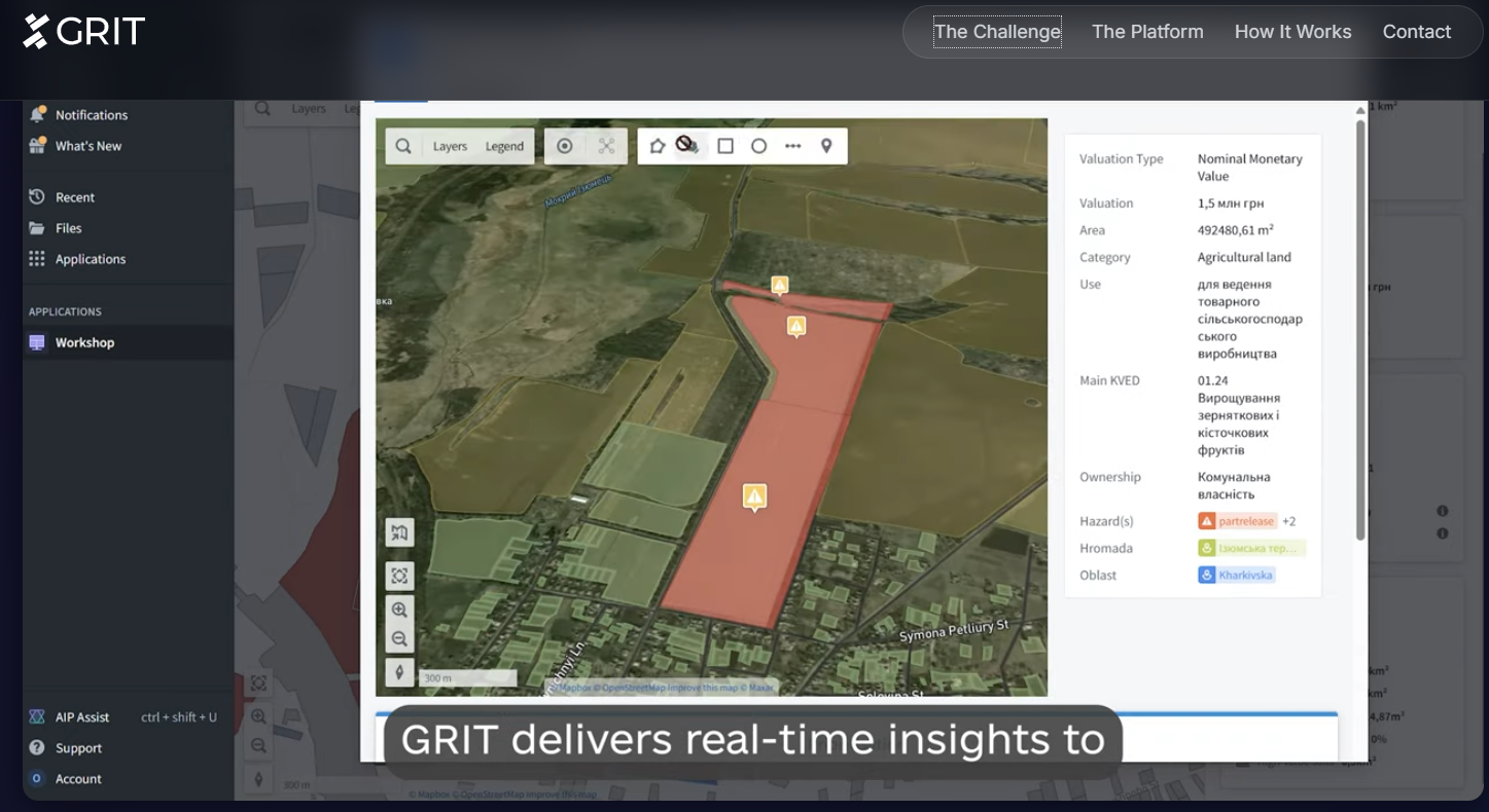 GRIT працює за принципом багаторівневої аналітичної моделі, що поєднує понад 100 наборів просторових, економічних, екологічних і соціальних даних із десятків різних джерел. Платформа автоматично інтегрує супутникові знімки, кадастрові шари, дані про бойові дії та пошкодження, топографію, інфраструктуру, аграрну діяльність, логістичні маршрути й демографічні показники. На цій основі формується цифровий профіль кожної ділянки – її просторовий, екологічний та функціональний «паспорт».